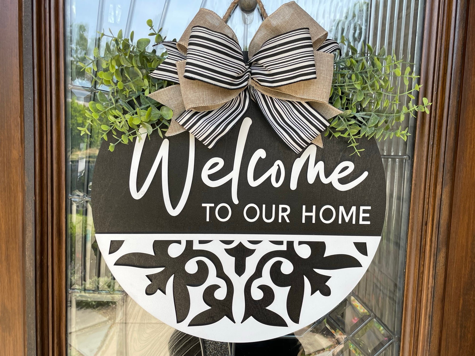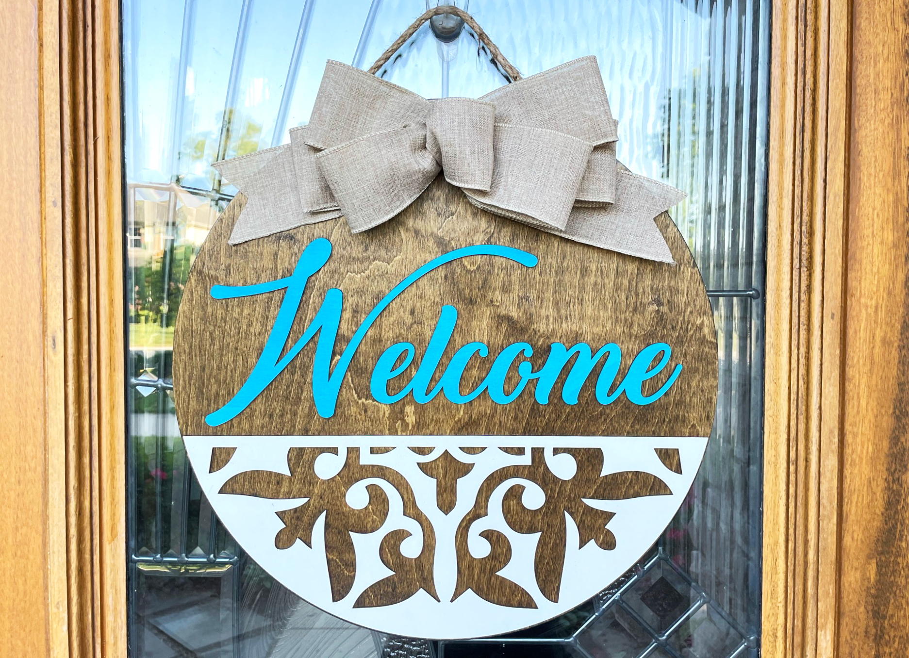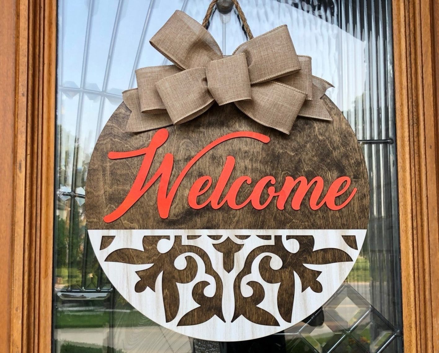 Greet your guests with this modern bohemian style round wood sign. A beautiful décor for your front door or wall inside or outside your home.