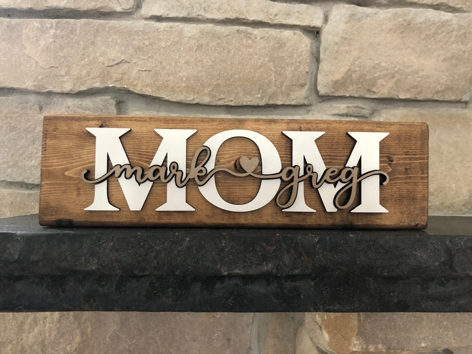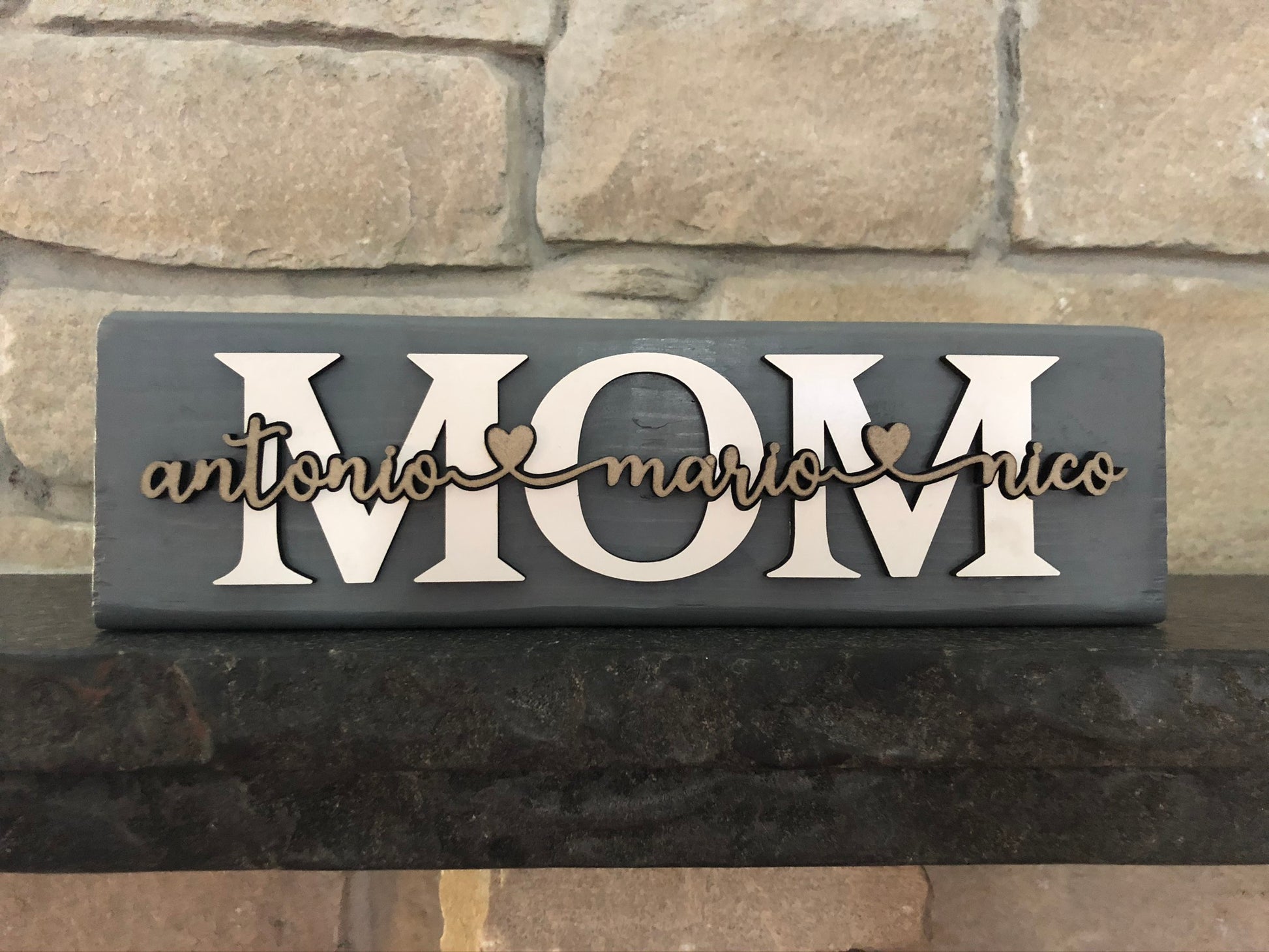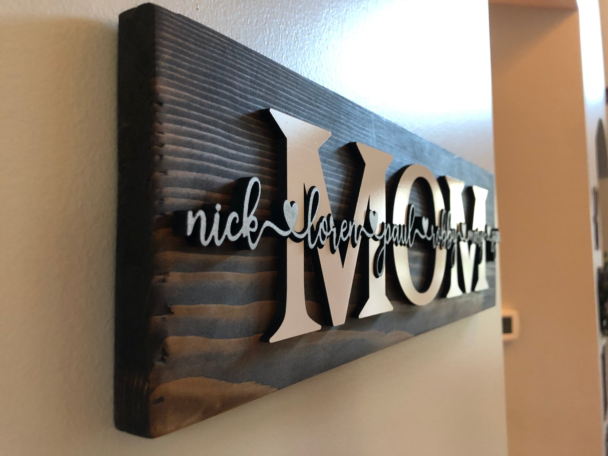 ✔MOM is painted white and cut from maple wood. Kids names are cut from a thicker draft board to create a beautiful, layered 3 dimensional affect.