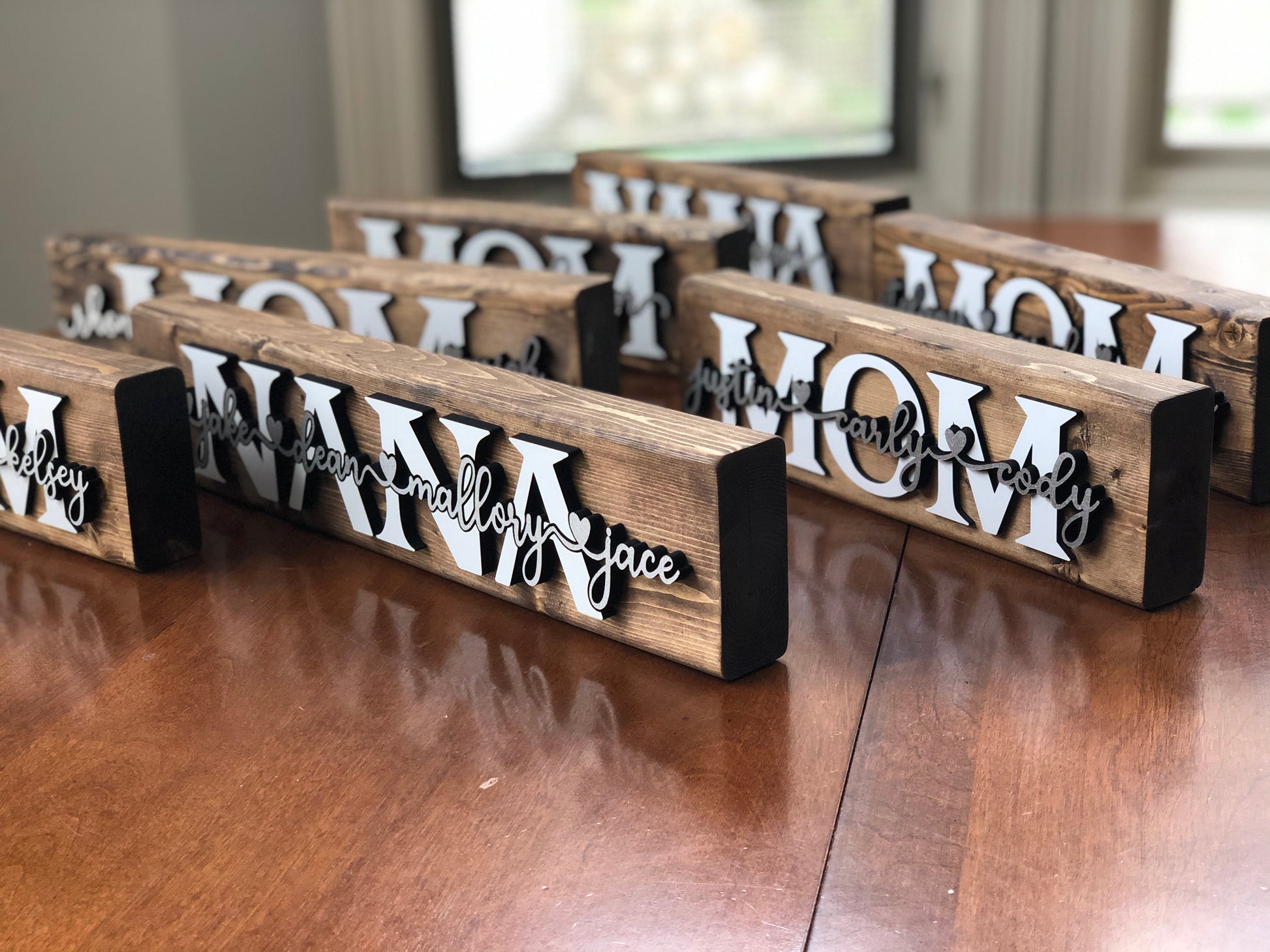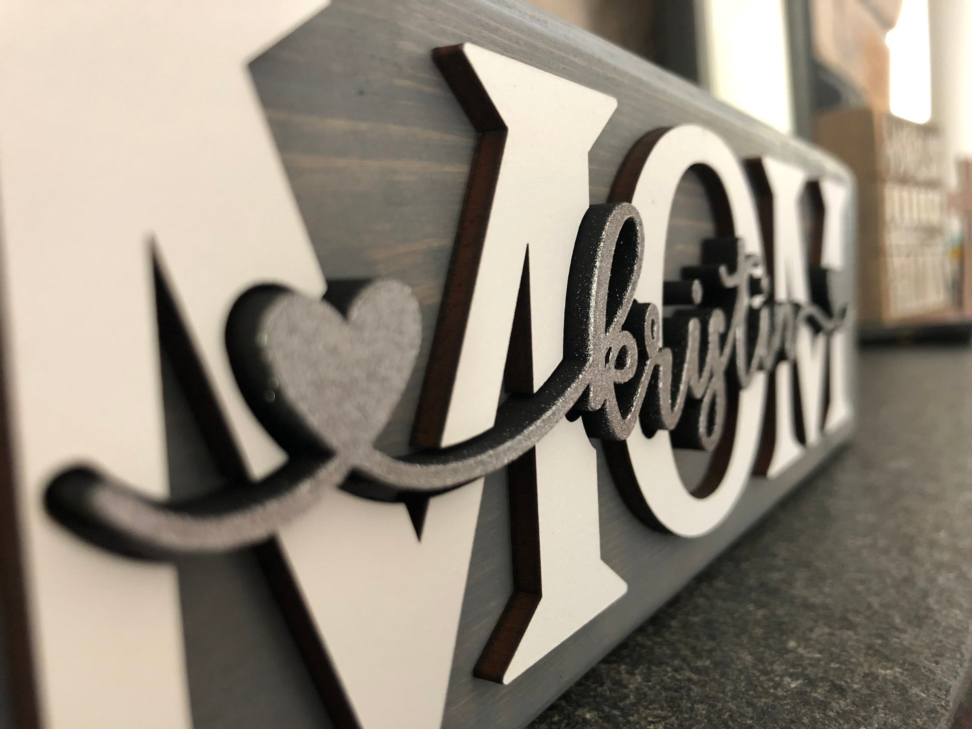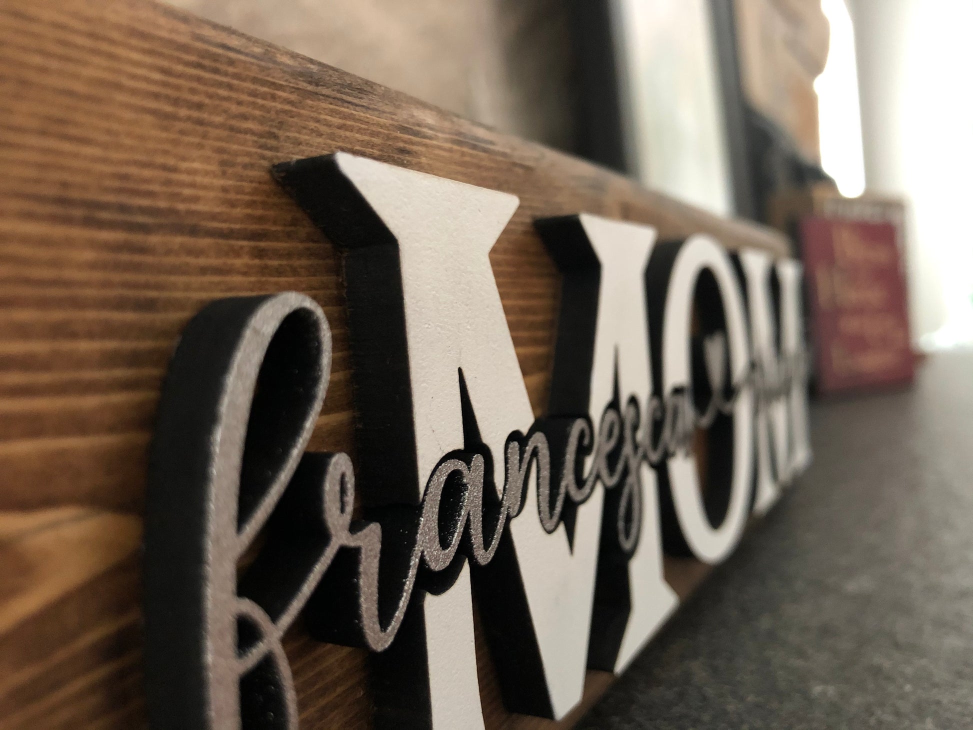 ✔MOM is painted white and cut from maple wood. Kids names are cut from a thicker draft board to create a beautiful, layered 3 dimensional affect.