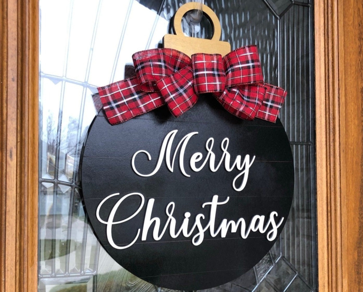 Enjoy the holiday season by displaying this two-layered ornament shaped door hanger. Can be displayed anywhere in your home as well!