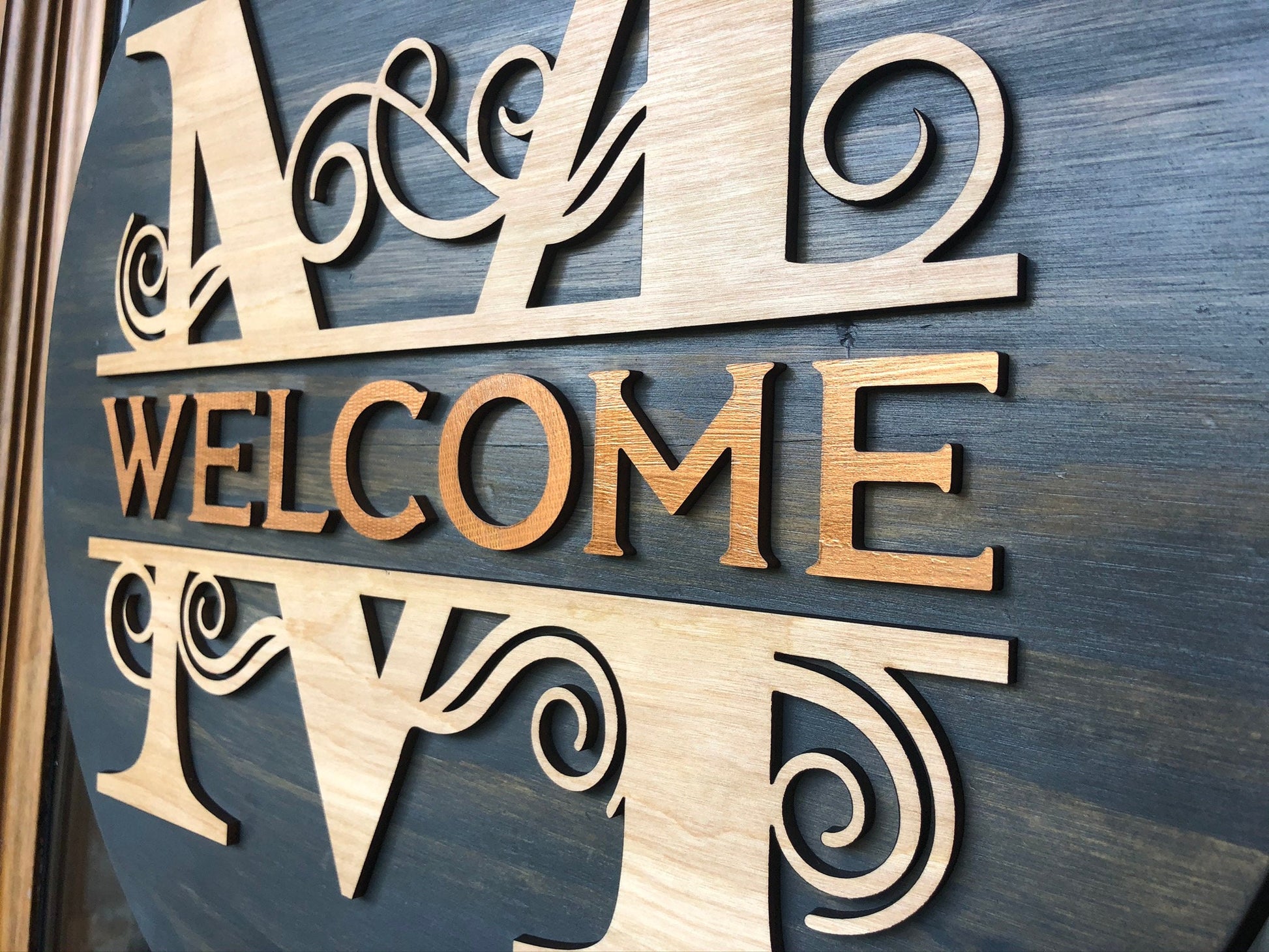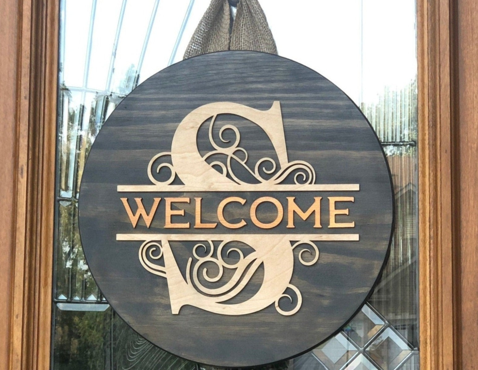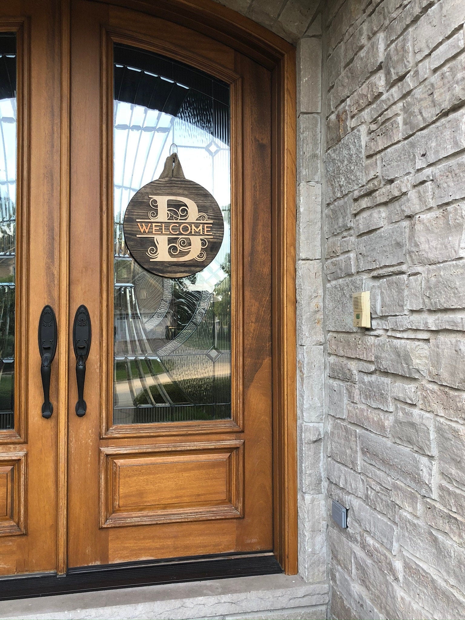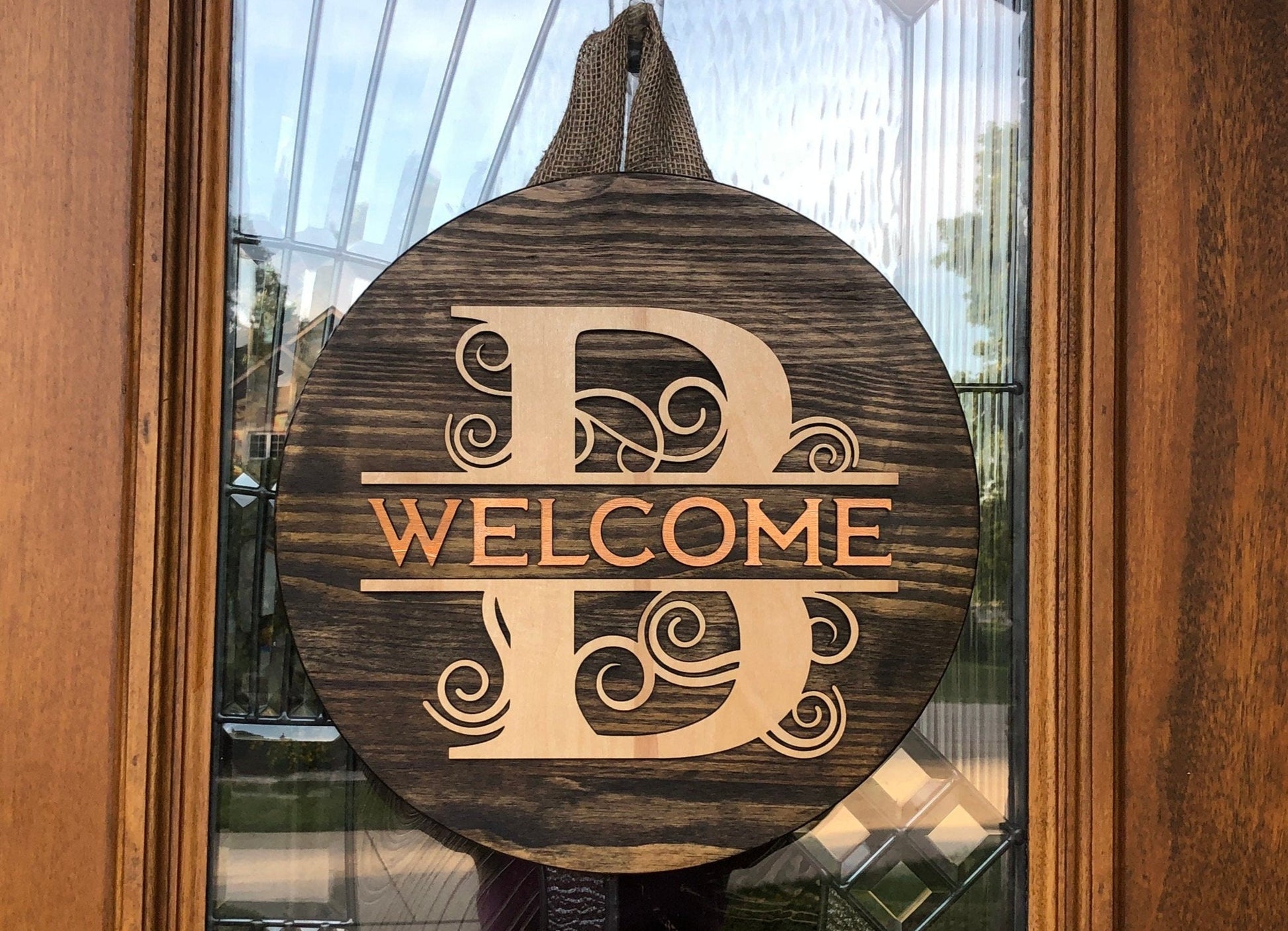 Greet your guests with this elegant custom monogram wood door hanger, personalized with your last initial and last name (or word of your choice). This sign will also look impressive any where in your home.