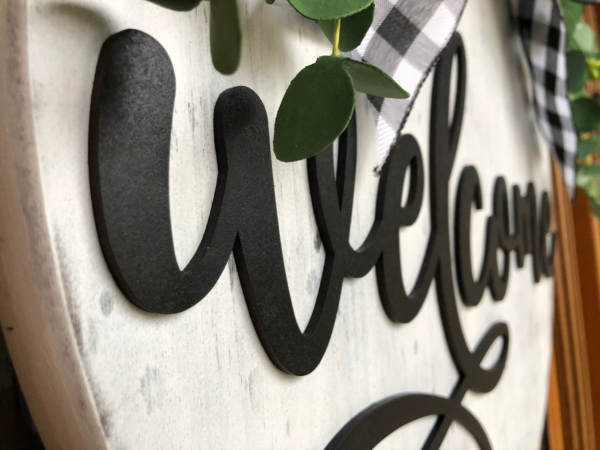 ✔ Background is painted white; the pumpkin cutout and welcome letters are stained brown and are raised creating a 3-dimensional look.