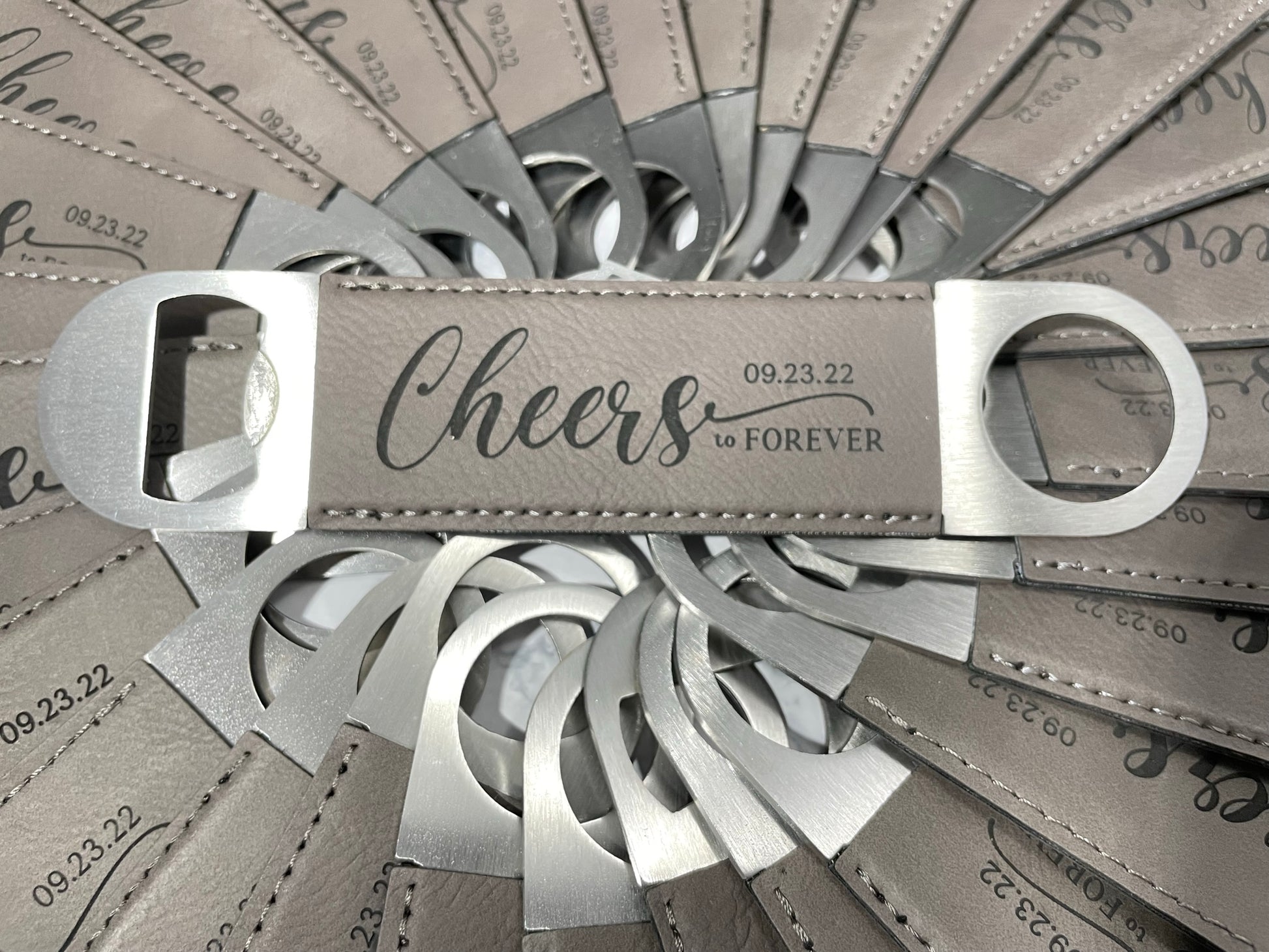 A beautiful accessory for your wedding/bachelor party favor, birthday milestone memento or house warming addition to a case of beer. This high-quality item will effortlessly open bottles, and is sure to impress!