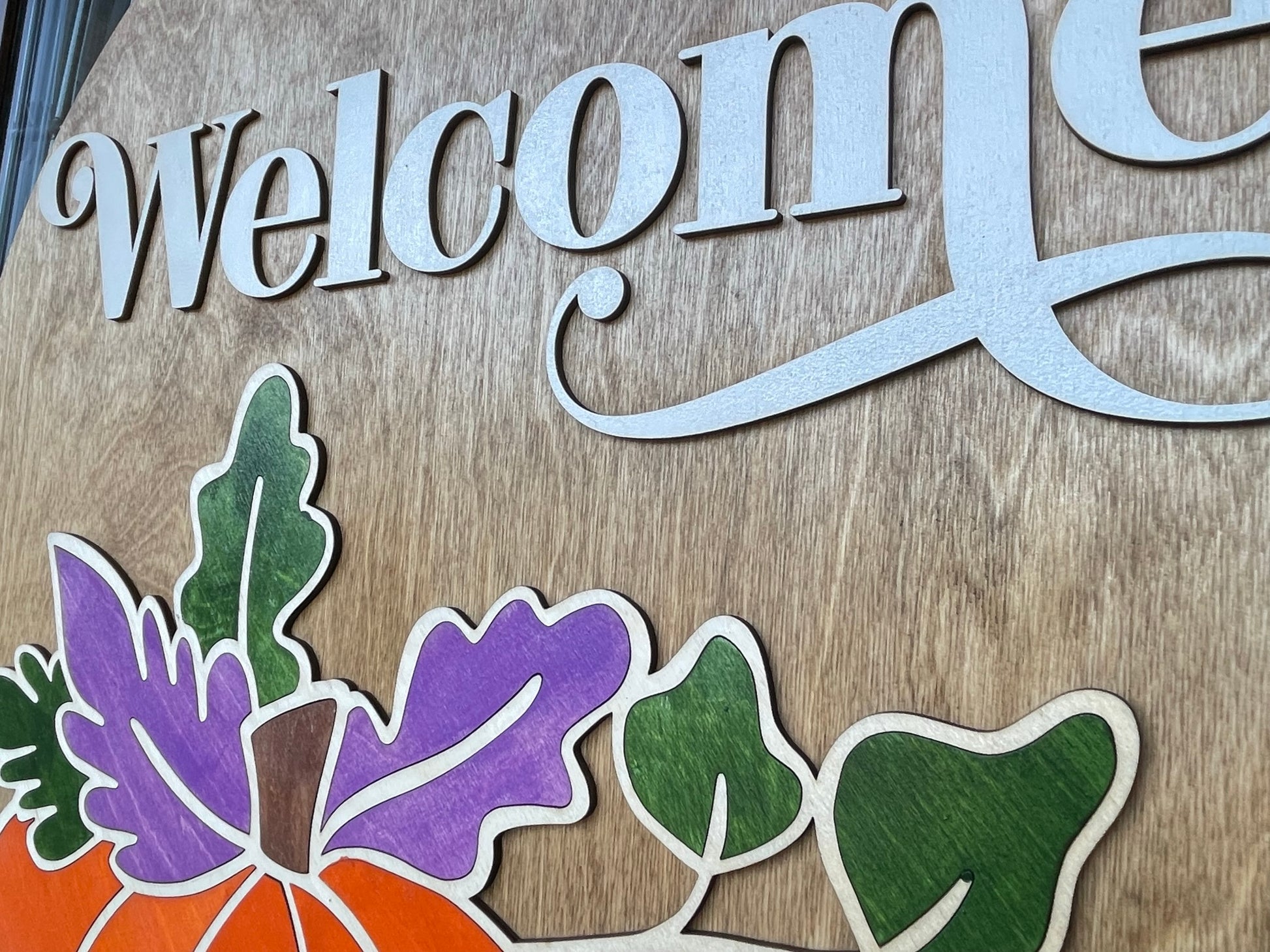 ✔ Board is stained in either dark or light brown; the pumpkin/leaves cutout is painted in coordinating fall tones.