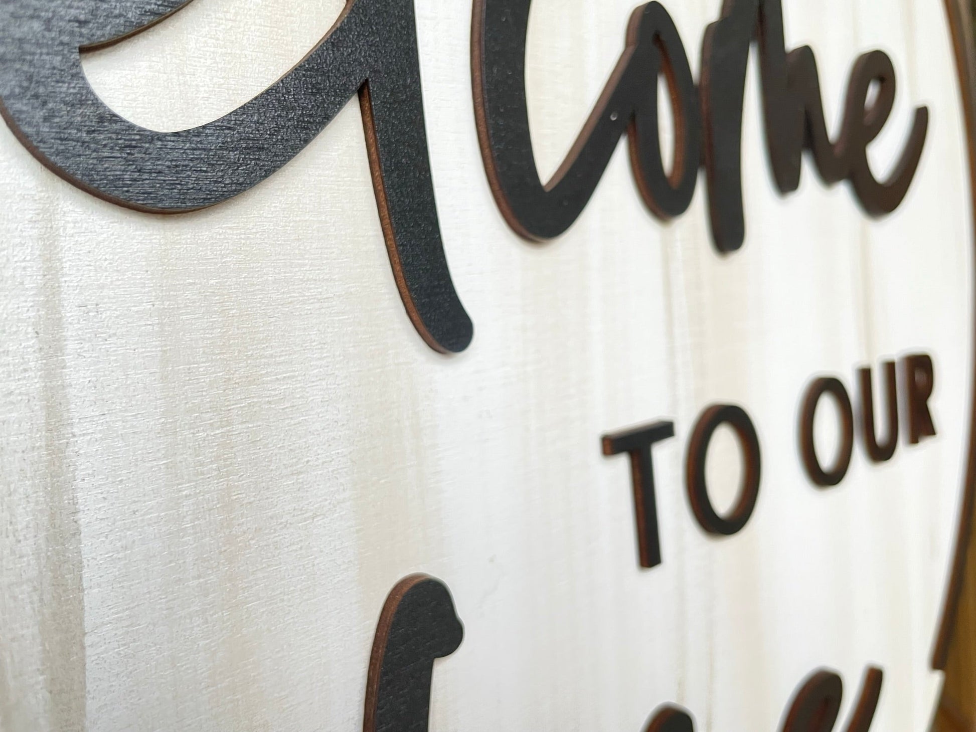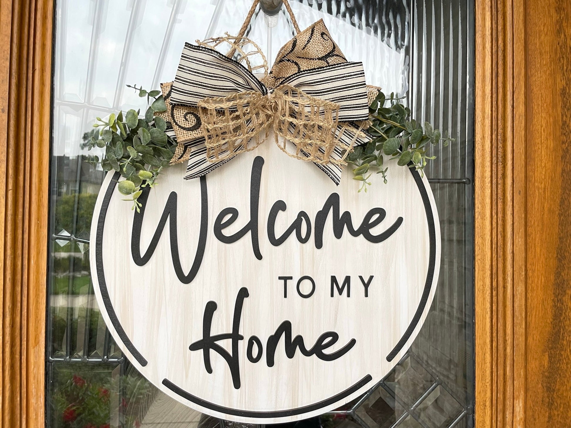 Greet your guests with this modern farmhouse style round wood sign. A beautiful décor for your front door or wall inside or outside your home.
