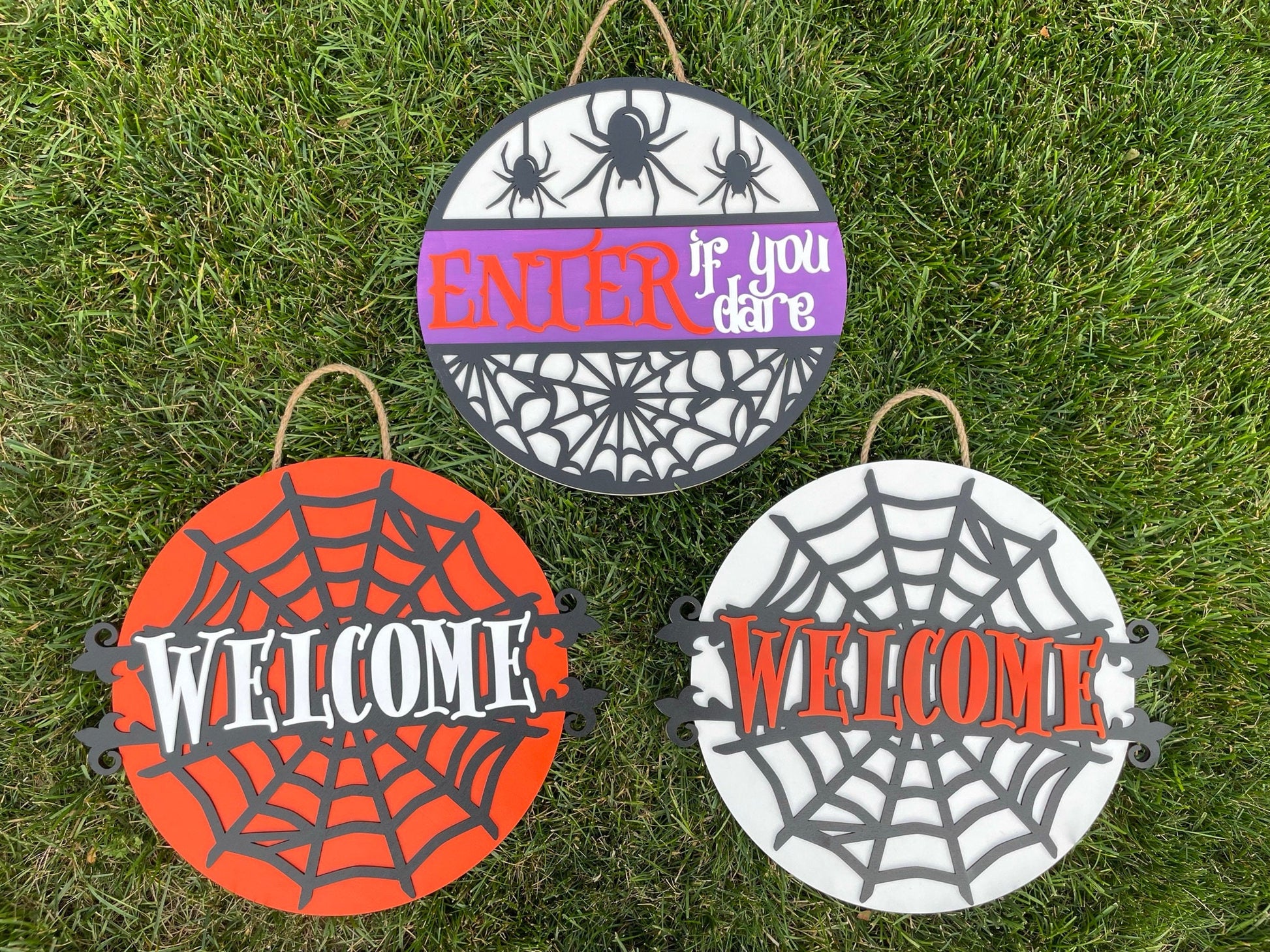 Welcome your trick or treaters and guests with this bright colored Halloween themed door hanger. A festive décor for your front door or wall inside or outside your home.