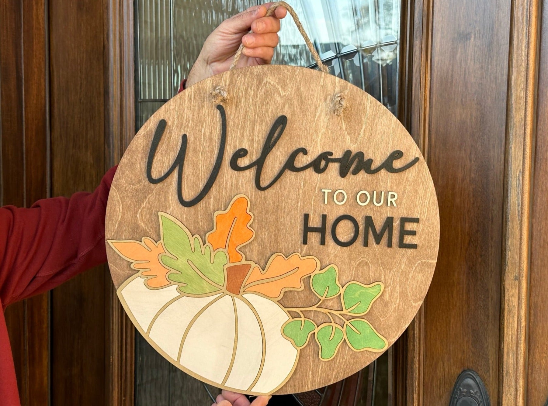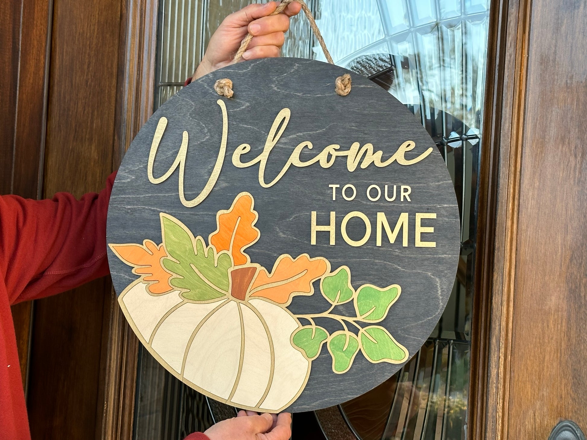 ✔ Board is stained in either gray or brown; the pumpkin/leaves outline is painted gold metallic.